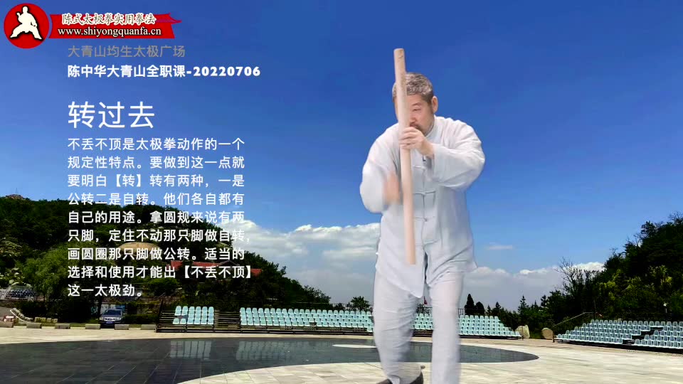 转过去-陈中华大青山全职课-20220706。不丢不顶是太极拳动作的一个规定性特点。要做到这一点就要明白【转】转有两种,一是公转二是自转。他们各自都有自己的用途。拿圆规来说有两只脚,定住不动那只脚做自转,画圆圈那只脚做公转。适当的选择和使用才能出【不丢不顶】这一太极劲。