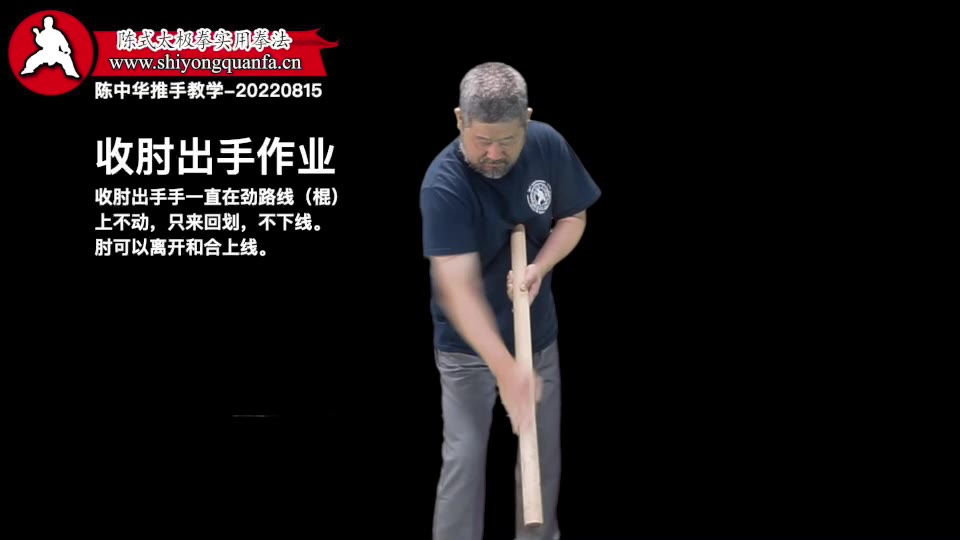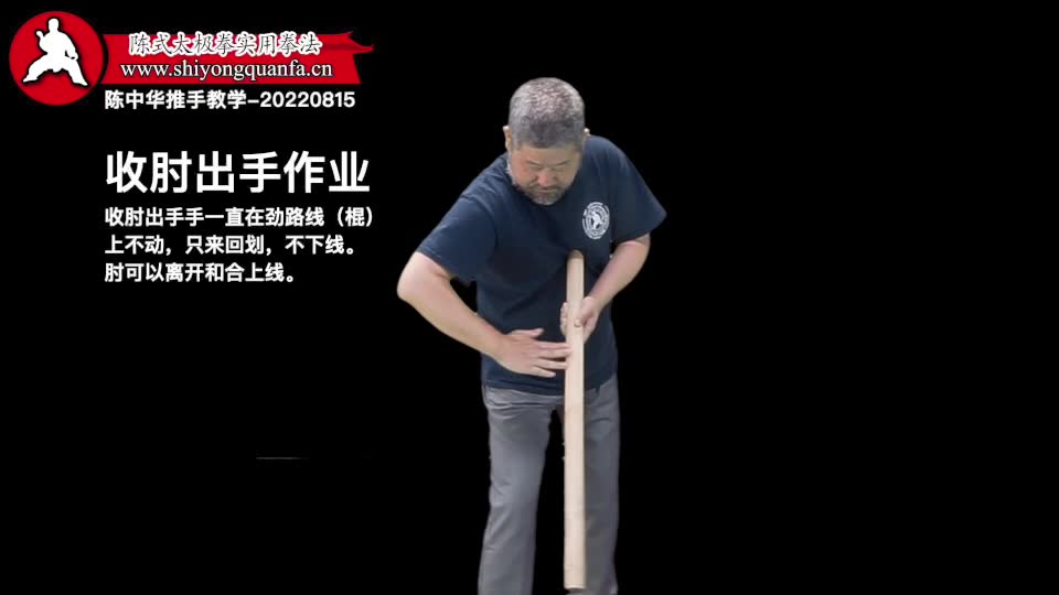 收肘出手作业-陈中华推手教学-20220815。收肘出手手一直在劲路线(棍)上不动,只来回划,不下线。肘可以离开和合上线。