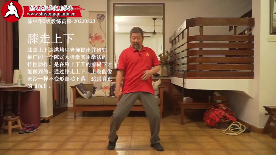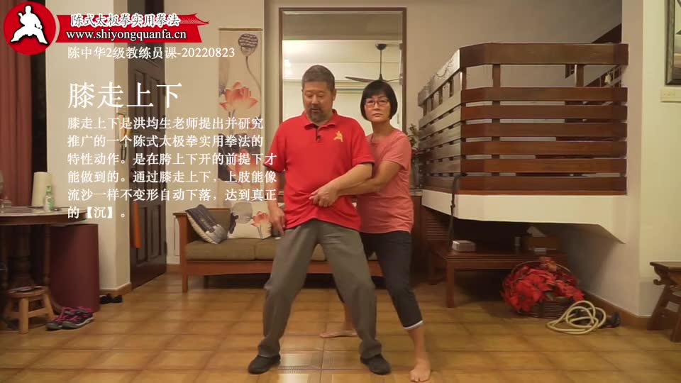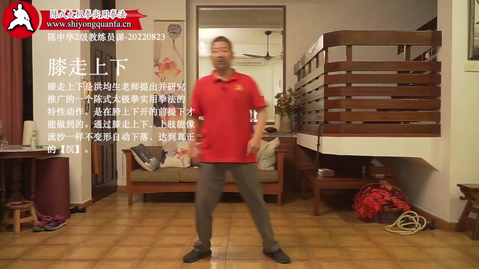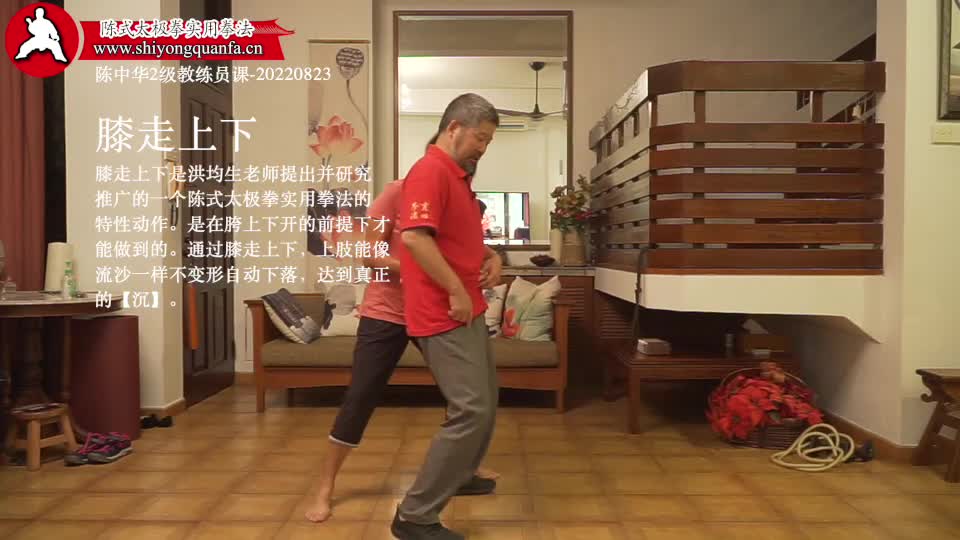 膝走上下-陈中华2级教练员课-20220823。膝走上下是洪均生老师提出并研究推广的一个陈式太极拳实用拳法的特性动作。是在胯上下开的前提下才能做到的。通过膝走上下,上肢能像流沙一样不变形自动下落,达到真正的【沉】。