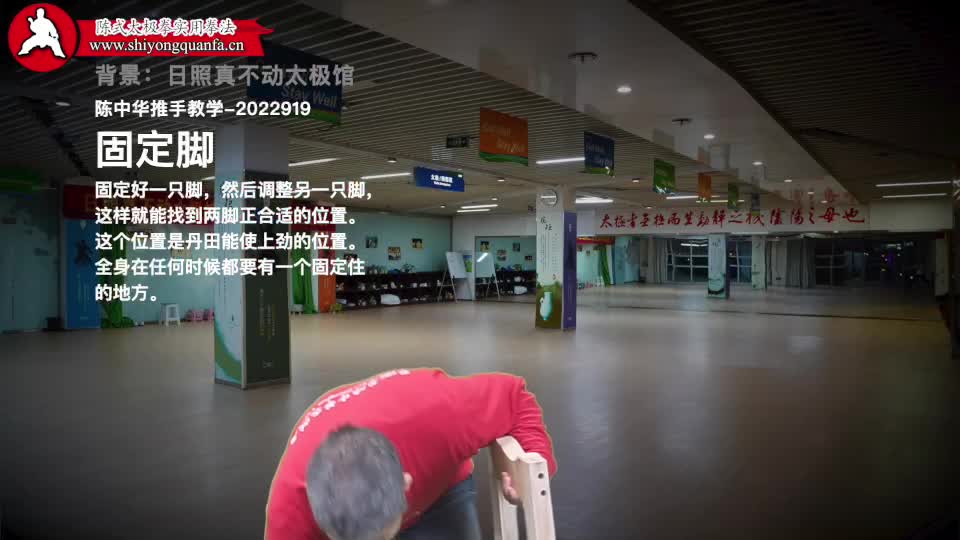 固定脚-陈中华推手教学-2022822。固定好一只脚,然后调整另一只脚,这样就能找到两脚正合适的位置。这个位置是丹田能使上劲的位置。全身在任何时候都要有一个固定住的地方。