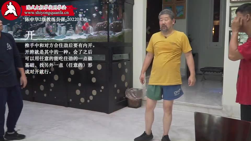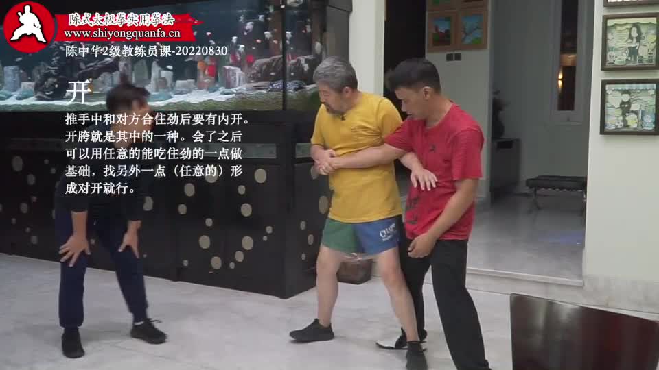 开-陈中华2级教练员课-20220830。 推手中和对方合住劲后要有内开。开胯就是其中的一种。会了之后可以用任意的能吃住劲的一点做基础,找另外一点(任意的)形成对开就行。