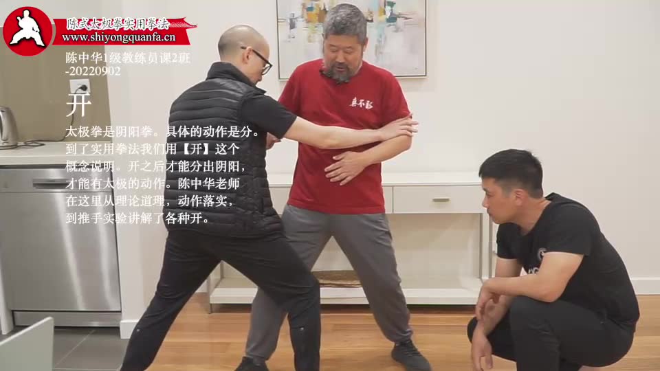 开-陈中华1级教练员课2班-20220902。太极拳是阴阳拳。具体的动作是分。到了实用拳法我们用【开】这个概念说明。开之后才能分出阴阳,才能有太极的动作。陈中华老师在这里从理论道理,动作落实,到推手实验讲解了各种开。