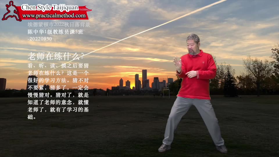 老师在练什么-陈中华1级教练员课5班-20220930。看、听、读、摸之后要猜老师在练什么?这是一个很好的学习方法。猜不对不要紧,猜多了,一定会慢慢猜对。猜对了,就是知道了老师的意念,就懂老师了,就有了学习的基础。