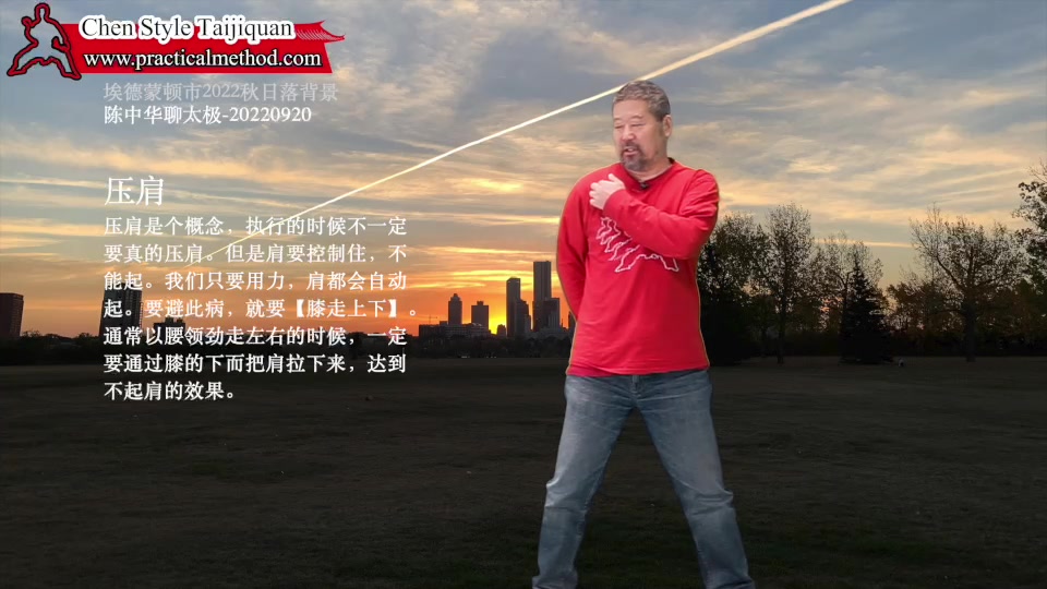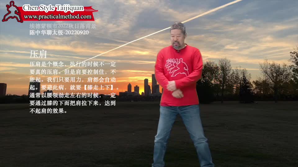 压肩-陈中华聊太极-20220920。压肩是个概念,执行的时候不一定要真的压肩。但是肩要控制住,不能起。我们只要用力,肩都会自动起。要避此病,就要做到【膝走上下】。通常以腰领劲走左右的时候,一定要通过膝的下而把肩拉下来,达到不起肩的效果。
