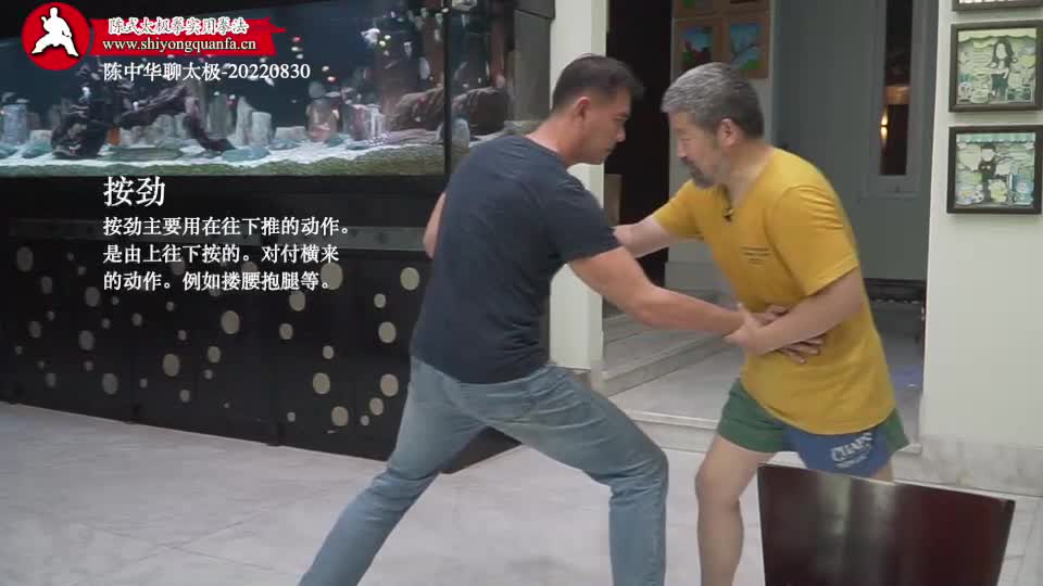 按劲-陈中华聊太极-20220830。按劲要用在往下推的动作。是由上往下按的。对付横来的动作。例如搂腰抱腿等。