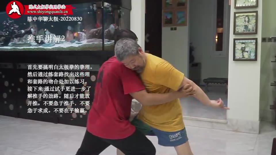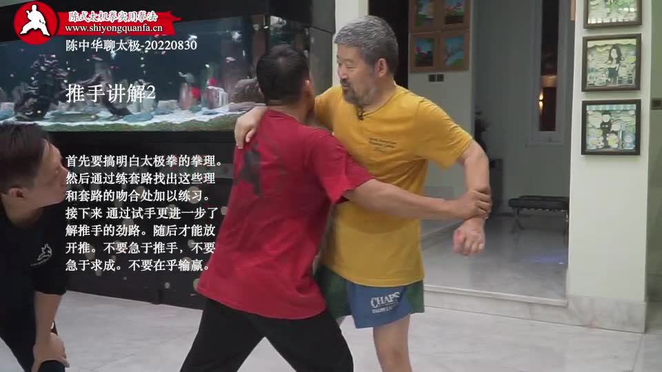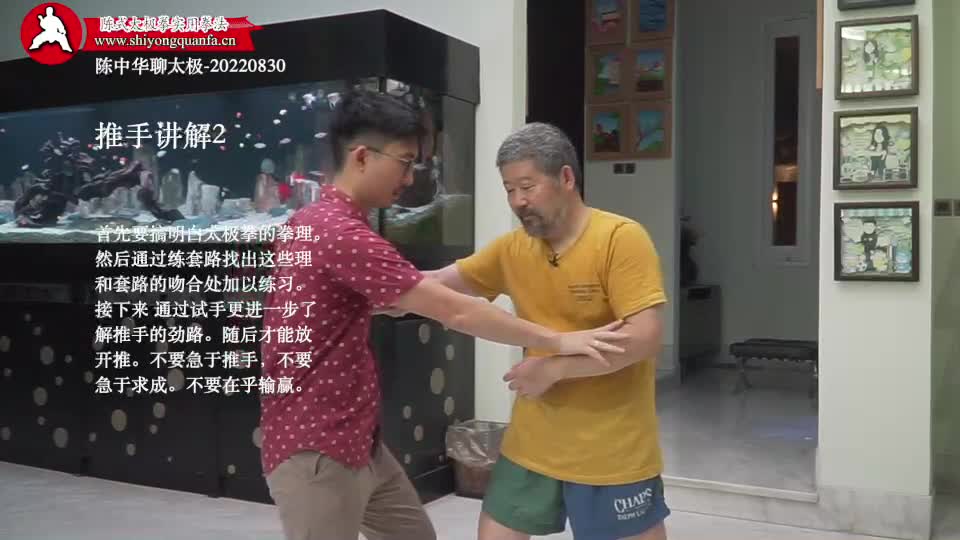 推手讲解1-陈中华聊太极-20220830。首先要搞明白太极拳的拳理。然后通过练套路找出这些理和套路的吻合处加以练习。接下来 通过试手更进一步了解推手的劲路。随后才能放开推。不要急于推手,不要急于求成。不要在乎输赢。