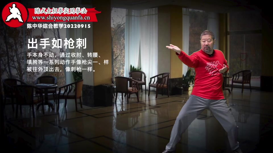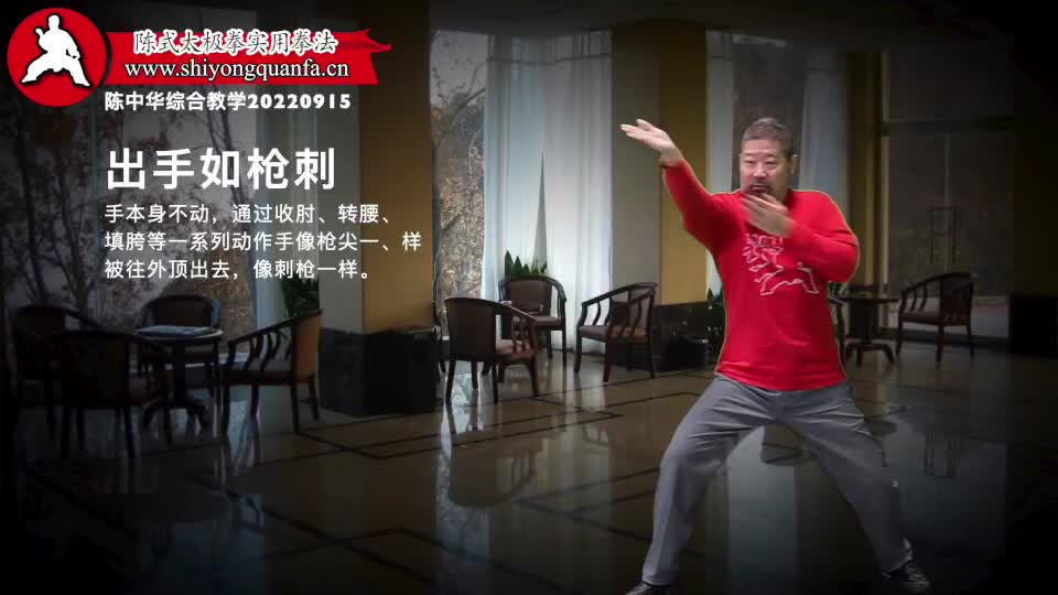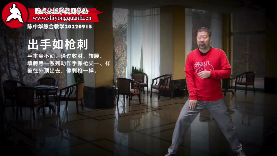 出手如枪刺-陈中华综合教学20220915。手本身不动,通过收肘、转腰、填胯等一系列动作手像枪尖一、样被往外顶出去,像刺枪一样。