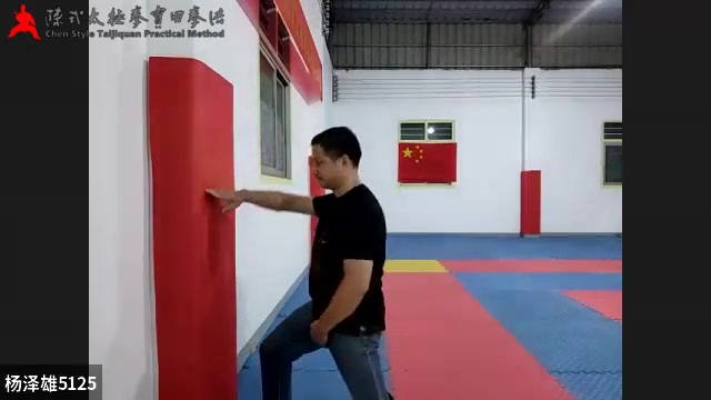 4、蹲下跟步。推手时,你就蹲下去,同时后退要跟步,一跟步。转的时候一跟步,协调一下,跟步小一,不要太过了。太极拳是练习腿的,手、头的动作幅度小;腿作的幅度大。不要撅屁股。