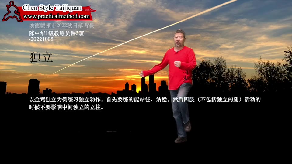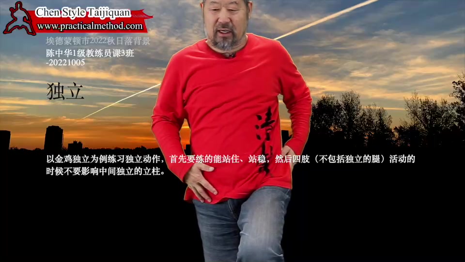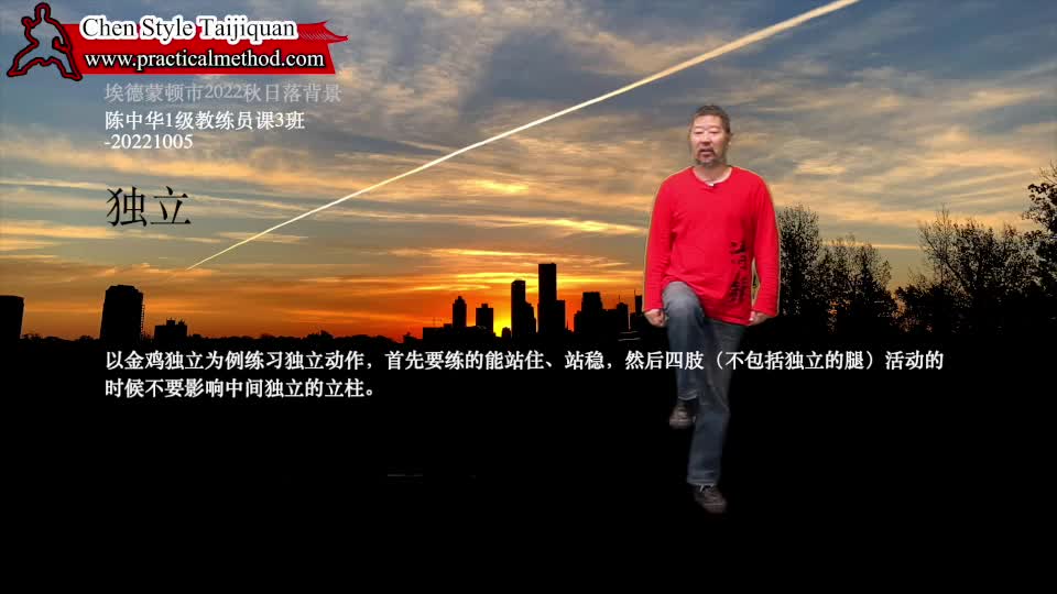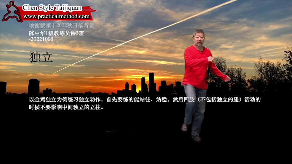 独立-陈中华1级教练员课3班-20221005。以金鸡独立为例练习独立动作,首先要练的能站住、站稳,然后四肢(不包括独立的腿)活动的时候不要影响中间独立的立柱。