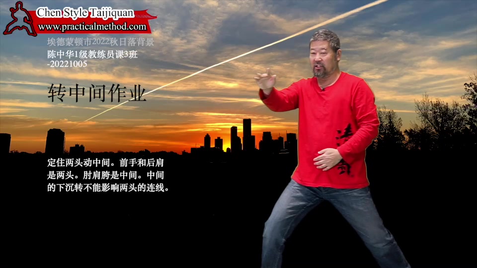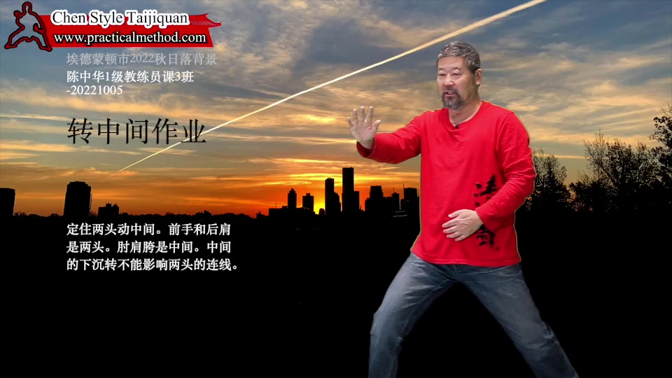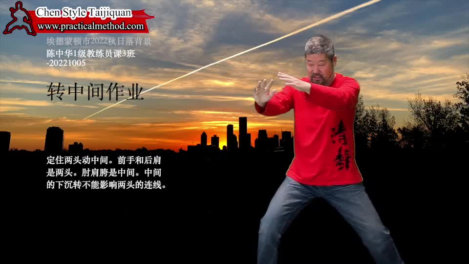 转中间作业-陈中华1级教练员课3班-20221005。定住两头动中间。前手和后肩是两头。肘肩胯是中间。中间的下沉转不能影响两头的连线。