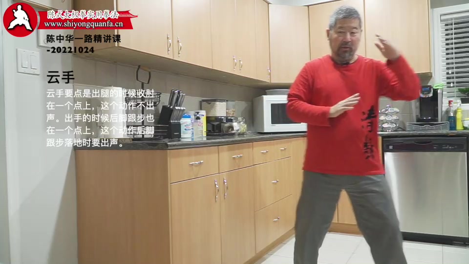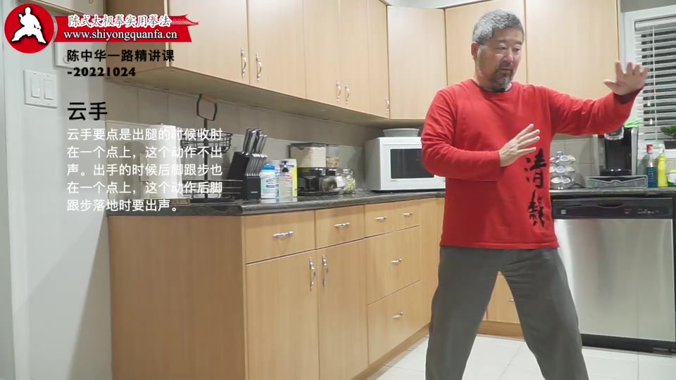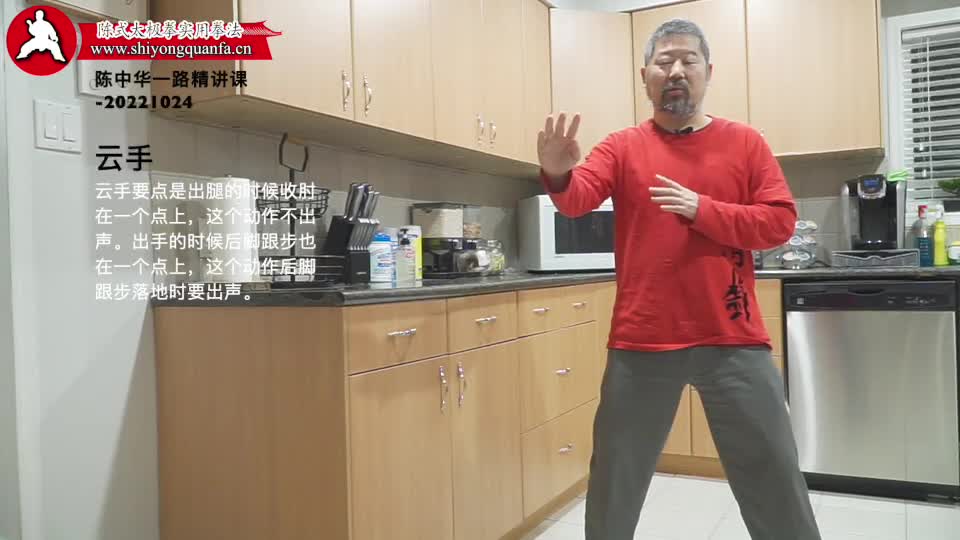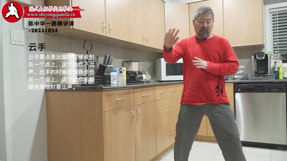云手-陈中华一路精讲课-20221024。云手要点是出腿的时候收肘在一个点上,这个动作不出声。出手的时候后脚跟步也在一个点上,这个动作后脚跟步落地时要出声。