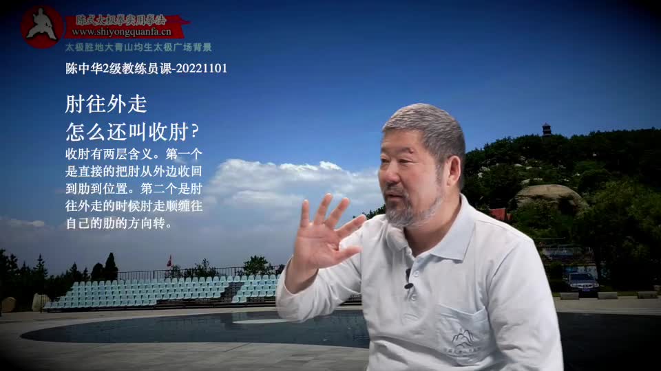 肘往外走怎么还叫收肘?-陈中华2级教课-20221101。收肘有两层含义。第一个是直接的把肘从外边收回到肋到位置。第二个是肘往外走的时候肘走顺缠往自己的肋的方向转。