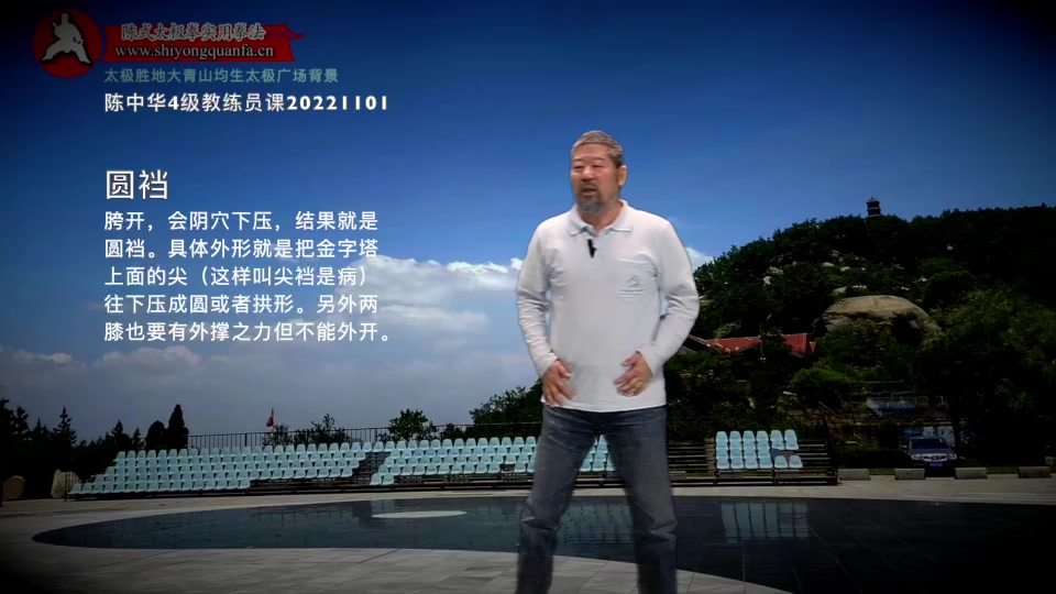 圆裆-陈中华4级教练员课20221101。胯开,会阴穴下压,结果就是圆裆。具体外形就是把金字塔上面的尖(这样叫尖裆是病)往下压成圆或者拱形。另外两膝也要有外撑之力但不能外开。