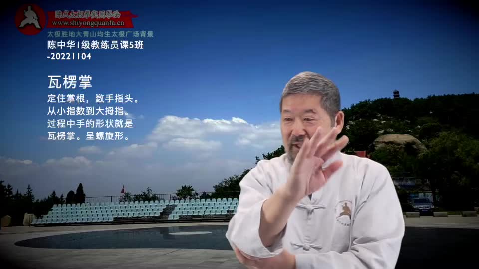瓦楞掌-陈中华1级教练员课5班-20221104。瓦楞掌 定住掌根,数手指头。 从小指数到大拇指。 过程中手的形状就是瓦楞掌。呈螺旋形,掌心定住不动。