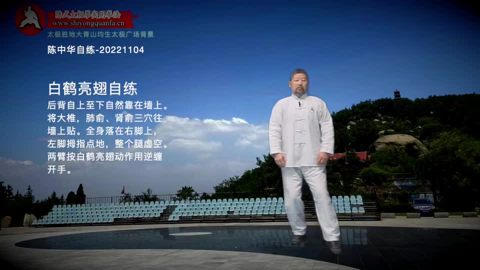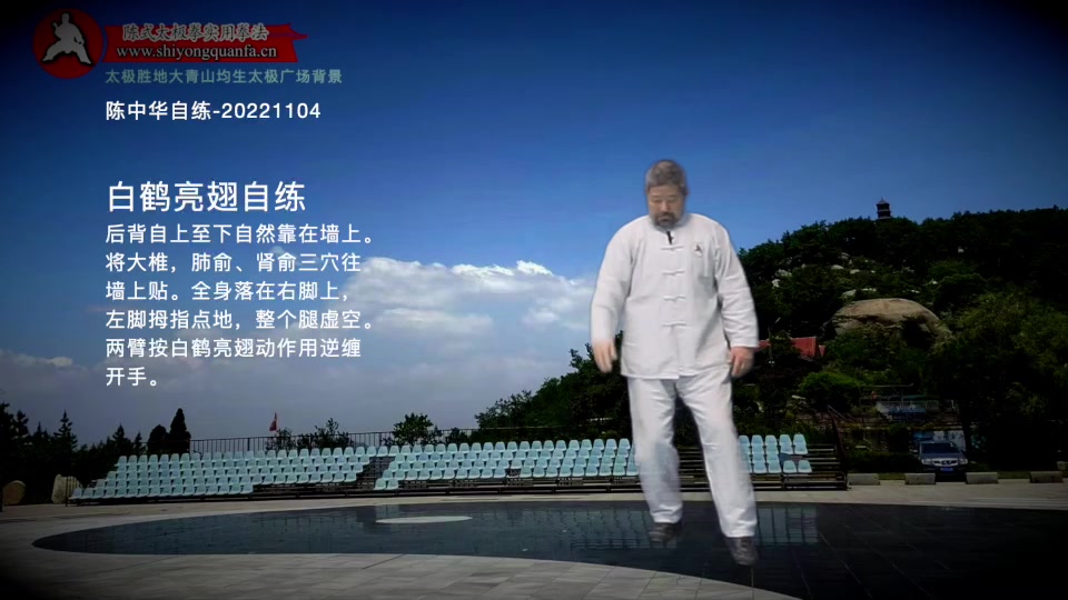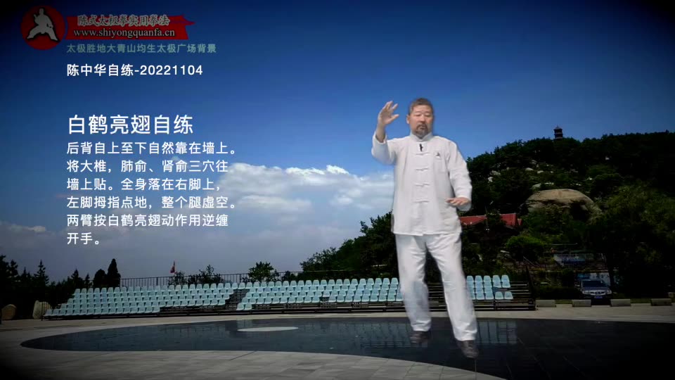 白鹤亮翅自练-陈中华自练-20221104。后背自上至下自然靠在墙上。将大椎,肺俞、肾俞三穴往墙上贴。全身落在右脚上,左脚拇指点地,整个腿虚空。两臂按白鹤亮翅动作用逆缠开手。