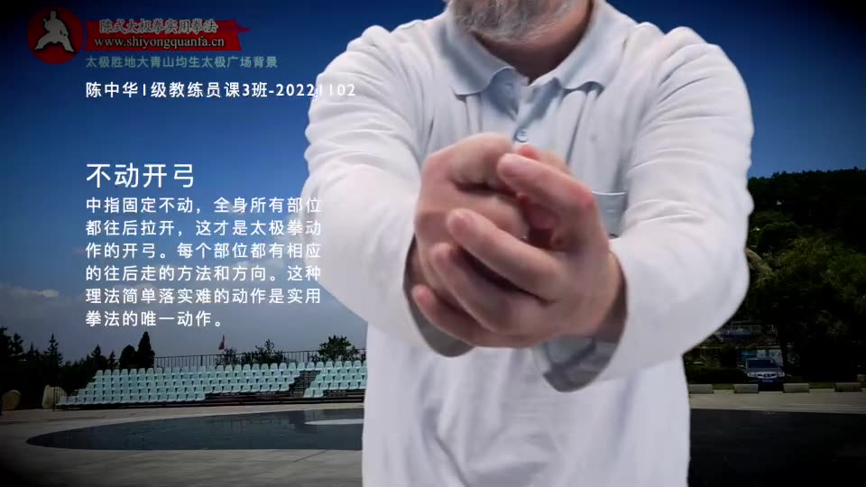 不动开弓-陈中华1级教练员课3班-20221102。中指固定不动,全身所有部位都往后拉开,这才是太极拳动作的开弓。每个部位都有相应的往后走的方法和方向。这种理法简单落实难的动作是实用拳法的唯一动作。