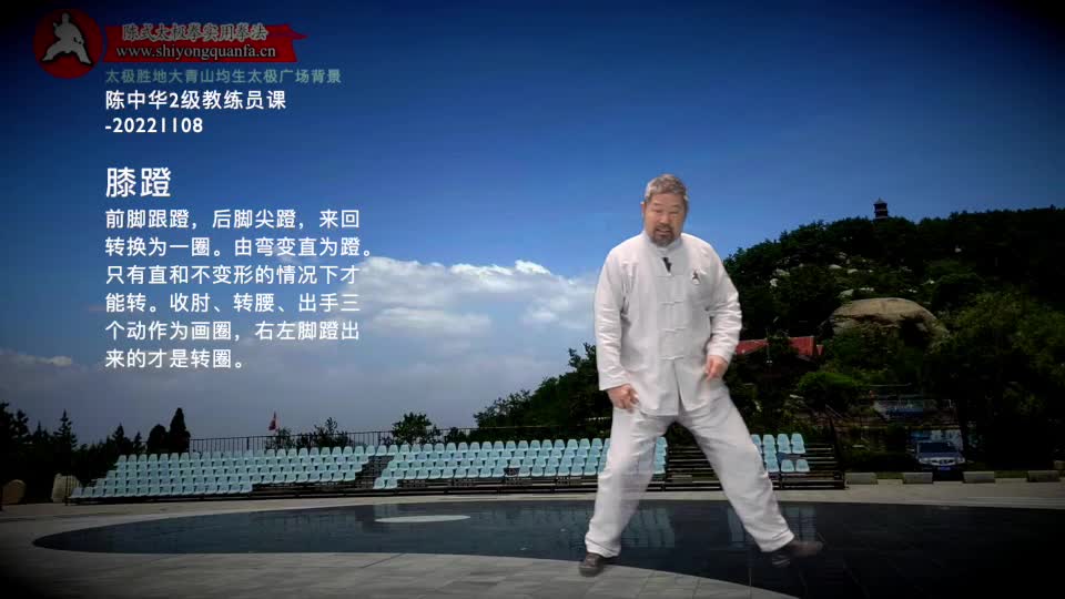 蹬-陈中华综合教学-20221108。所有的动作都是通过两脚蹬出来的。陈中华老师在这个视频里讲解了什么是蹬,怎么蹬,和【蹬】在拳的套路里的运用。 膝蹬-陈中华2级教练员课-20221108。前脚跟蹬,后脚尖蹬,来回转换为一圈。由弯变直为蹬。只有直和不变形的情况下才能转。收肘、转腰、出手三个动作为画圈,右左脚蹬出来的才是转圈。