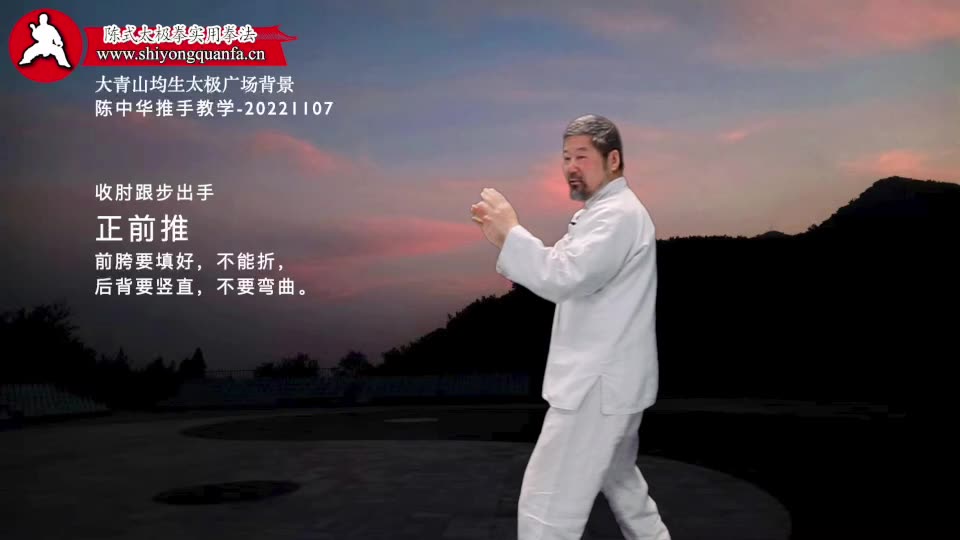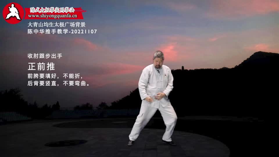正前推-陈中华推手教学-20221107。收肘跟步出手,正前推。前胯要填好,不能折,后背要竖直,不要弯曲。