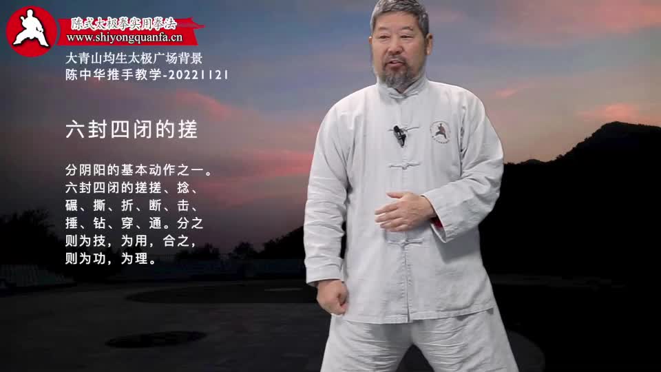 六封四闭的搓-陈中华推手教学-20221121。分阴阳的基本动作之一。六封四闭的搓搓、捻、碾、撕、折、断、击、捶、钻、穿、通。分之则为技,为用,合之,则为功,为理。