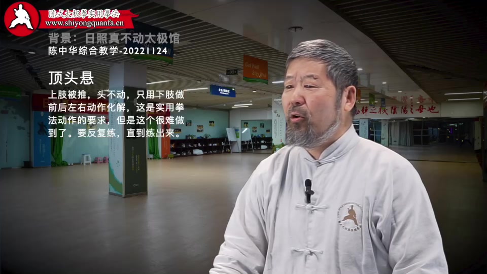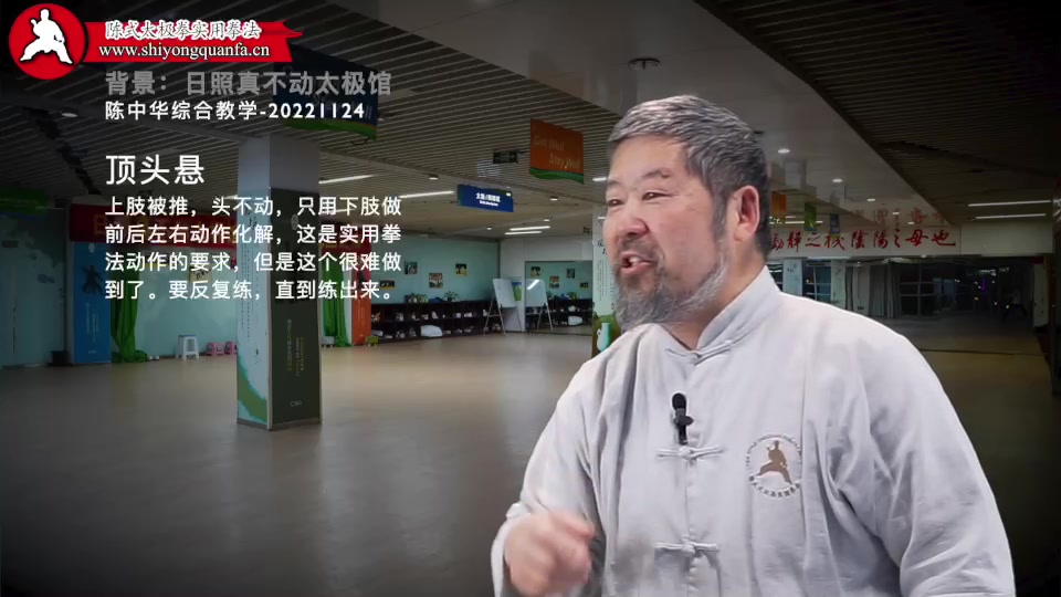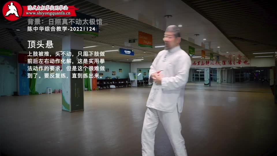 顶头悬-陈中华综合教学-20221124。上肢被推,头不动,只用下肢做前后左右动作化解,这是实用拳法动作的要求,但是这个很难做到了。要反复练,直到练出来。
