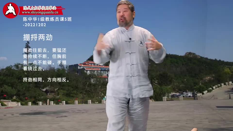 掤捋两劲-陈中华1级教练员课5班-20221202。掤劲往前去,要猛还要持续不断,但胸前有一点不能碰。手掤着绕过去。捋劲相同,方向相反。