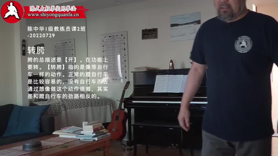 转胯-陈中华1级教练员课2班-20220729。胯的总描述是【开】。在功能上要转。【转胯】指的是像等自行车一样的动作。正常的蹬自行车是比较容易的,没有自行车而去通过想像做这个动作很难,其实是和蹬自行车的劲路相反的。