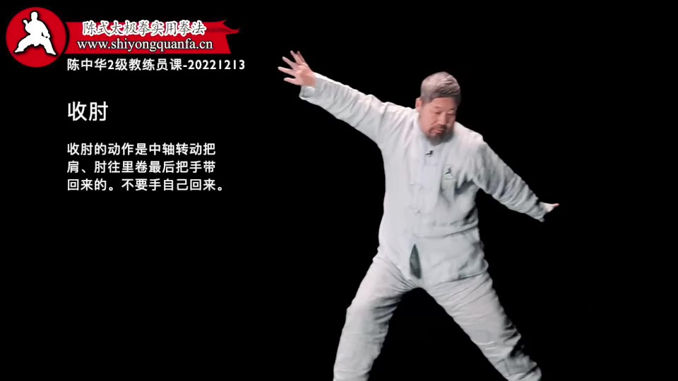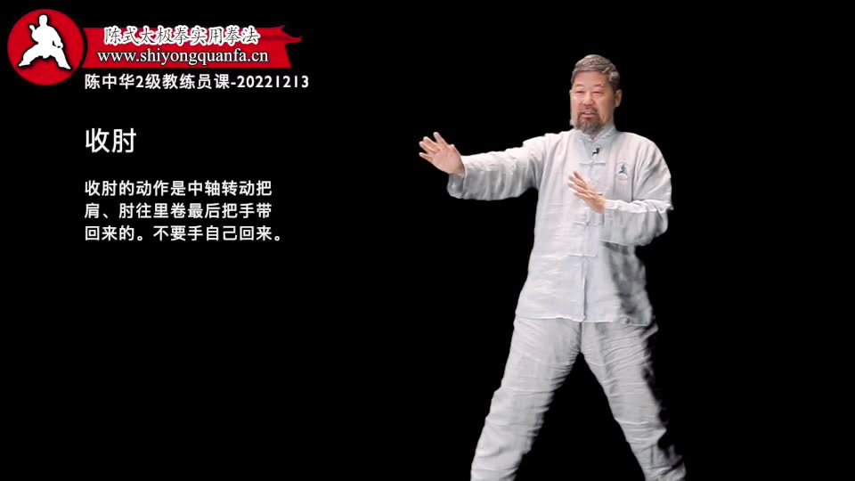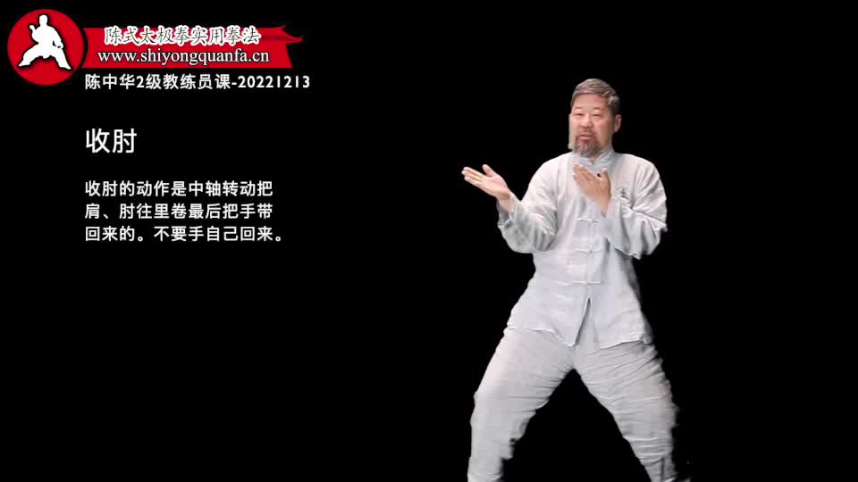 收肘-陈中华2级教练员课-20221213。收肘的动作是中轴转动把肩、肘往里卷最后把手带回来的。不要手自己回来。