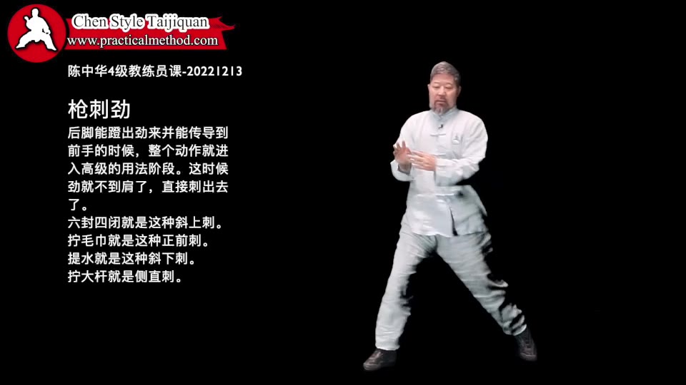 枪刺劲-陈中华4级教练课-20221213。后脚能蹬出劲来并能传导到前手的时候,整个动作就进入高级的用法阶段。这时候劲就不到肩了,直接刺出去了。六封四闭就是这种斜上刺。 拧毛巾就是这种正前刺。提水就是这种斜下刺。拧大杆就是侧直刺。