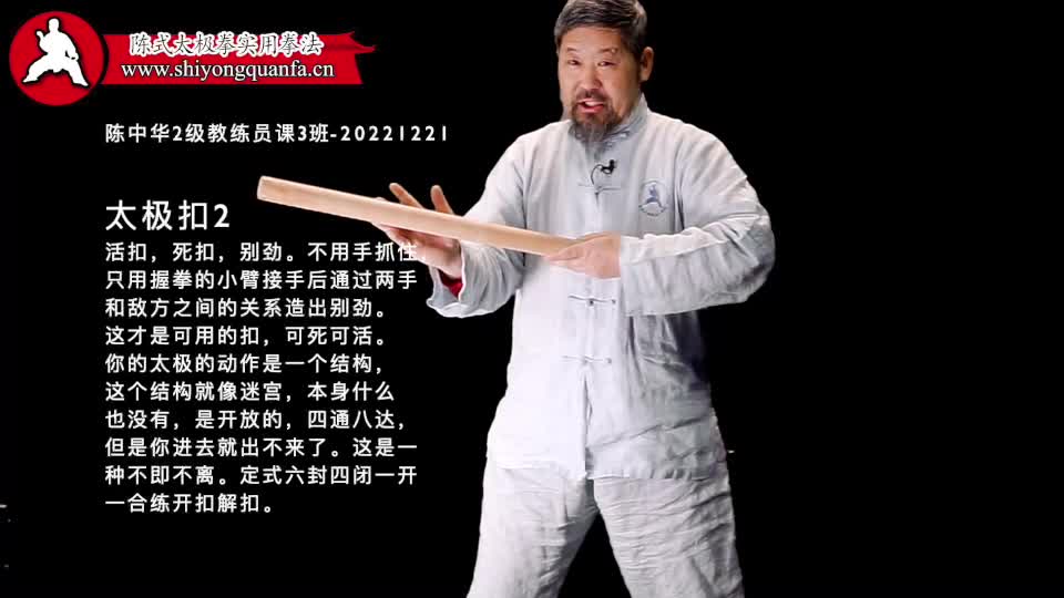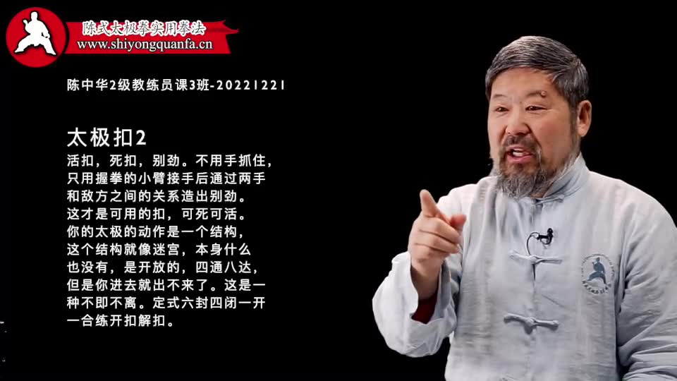 太极扣-陈中华2级教练员课3班-20221221。活扣,死扣,别劲。不用手抓住,只用握拳的小臂接手后通过两手和敌方之间的关系造出别劲。这才是可用的扣,可死可活。你的太极的动作是一个结构,这个结构就像迷宫,本身什么也没有,是开放的,四通八达,但是你进去就出不来了。这是一种不即不离。定式六封四闭一开一合练开扣解扣。
