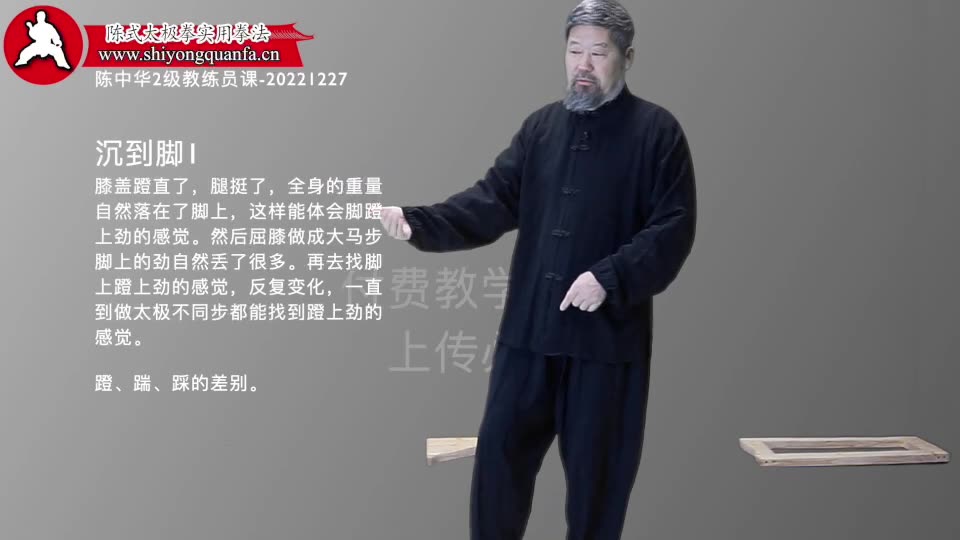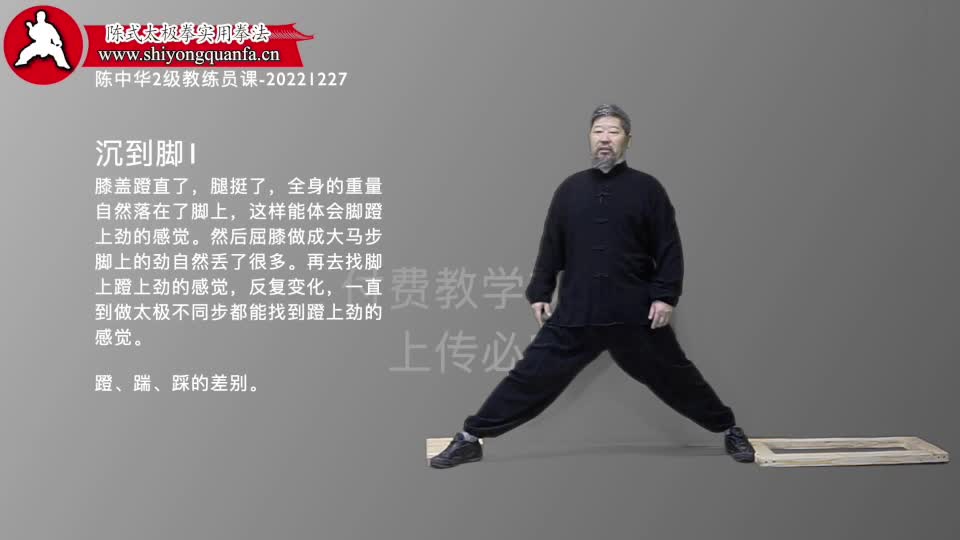 沉到脚1-陈中华2级教练员课-20221227。膝盖蹬直了,腿挺了,全身的重量自然落在了脚上,这样能体会脚蹬上劲的感觉。然后屈膝做成大马步脚上的劲自然丢了很多。再去找脚上蹬上劲的感觉,反复变化,一直到做太极不同步型都能找到蹬上劲的感觉。蹬、踹、踩的差别。