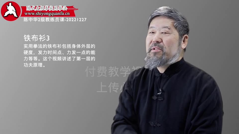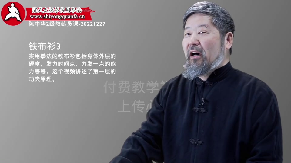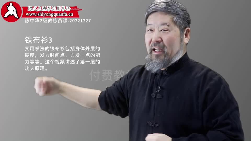 铁布衫3-陈中华2级教练员课-20221227。实用拳法的铁布衫包括身体外层的硬度,发力时间点、力发一点的能力等等。这个视频讲述了第一层的功夫原理。