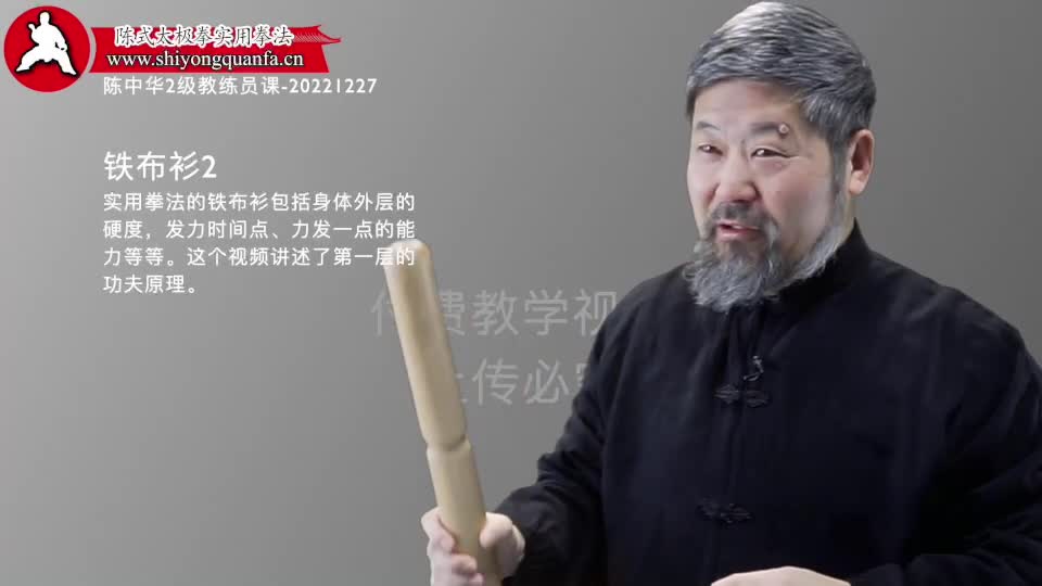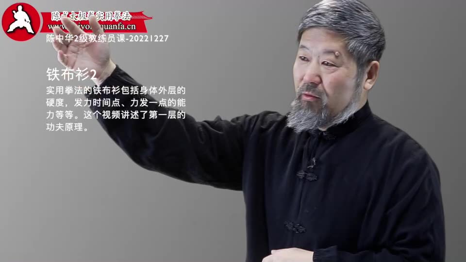 铁布衫2-陈中华2级教练员课-20221227。实用拳法的铁布衫包括身体外层的硬度,发力时间点、力发一点的能力等等。这个视频讲述了第一层的功夫原理。