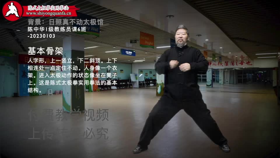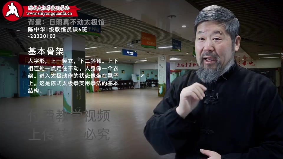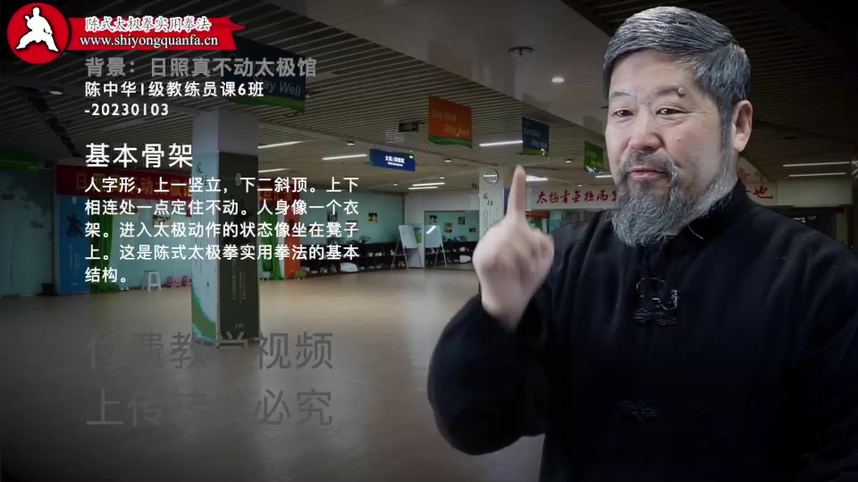 基本骨架花絮-陈中华1级教练员课6班-20230103。人字形,上一竖立,下二斜顶。上下相连处一点定住不动。人身像一个衣架。进入太极动作的状态像坐在凳子上。这是陈式太极拳实用拳法的基本结构。