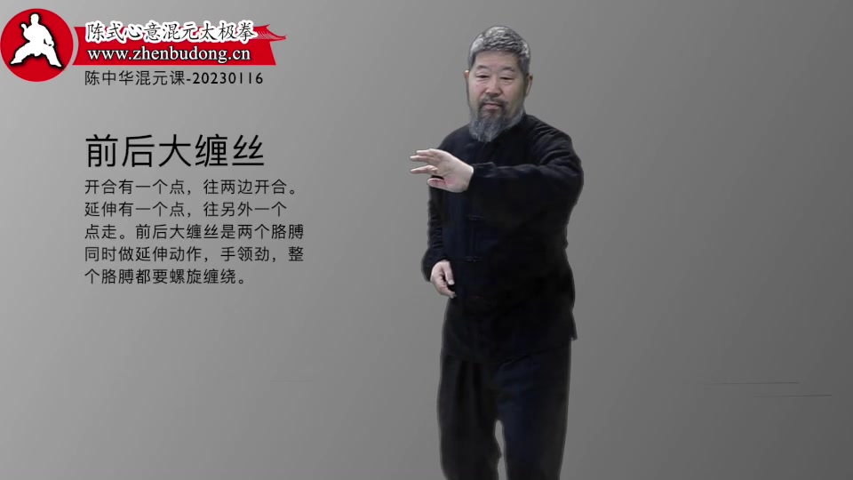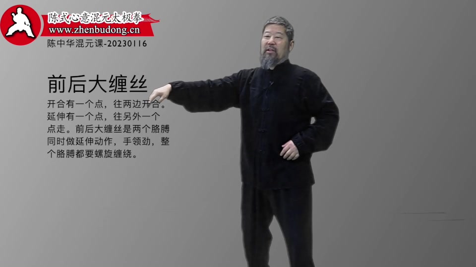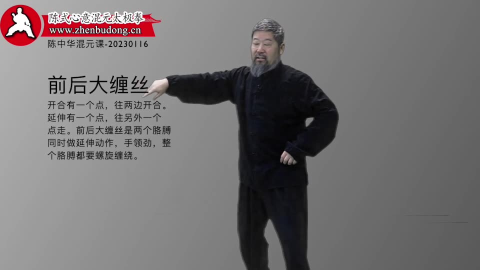 开合和延伸前后大缠丝-陈中华混元课-20230116。开合有一个点,往两边开合。延伸有一个点,往另外一个点走。前后大缠丝是两个胳膊同时做延伸动作,手领劲,整个胳膊都要螺旋缠绕。-陈中华混元课-20230116。开合有一个点,往两边开合。延伸有一个点,往另外一个点走。