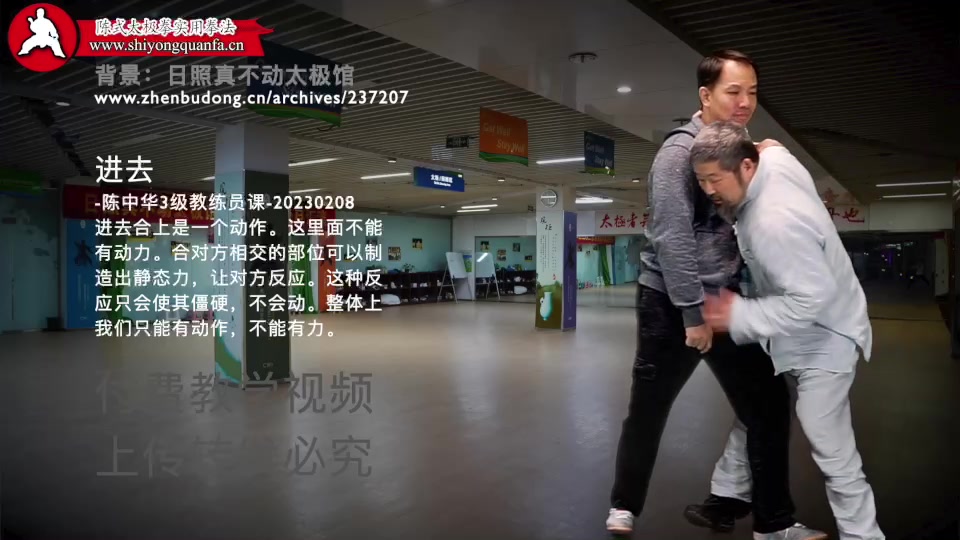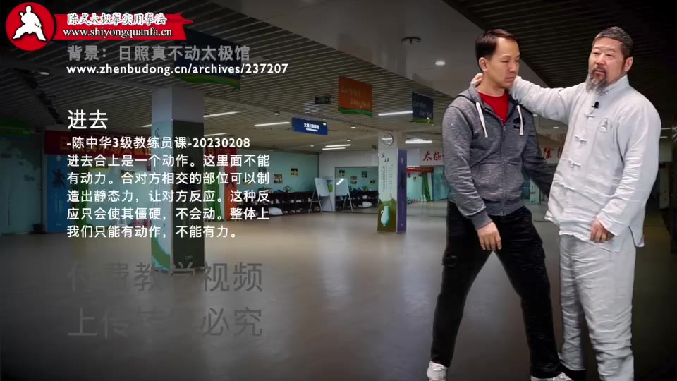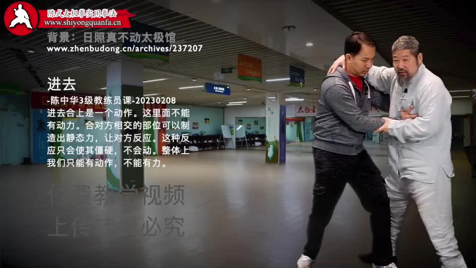 www.zhenbudong.cn/archives/237207 进去-陈中华3级教练员课-20230208。进去合上是一个动作。这里面不能有动力。合对方相交的部位可以制造出静态力,让对方反应。这种反应只会使其僵硬,不会动。整体上我们只能有动作,不能有力。两个都没有力的动作,产生了力。