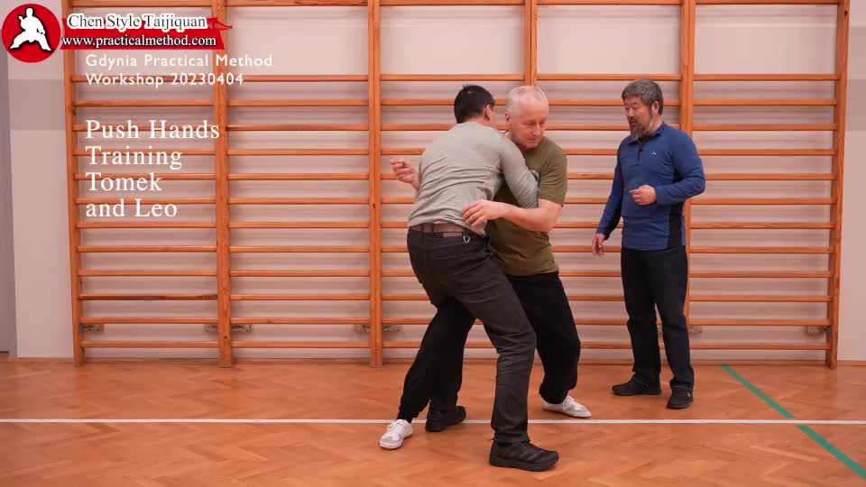 英文:陈中华老师在2023年4月4日波兰格丁尼亚实用拳法讲座后给汤米克和宋振华讲解推手中的上合下沉打左右。下沉用流沙的劲路。