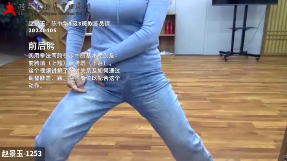 赵景玉:陈中华2级了班教练员课-20230405 前后胯 实用拳法两胯在步中的基本原则是: 前胯填(上翘)后胯塌(下落)。 这个视频讲解了这对关系及如何通过调整膝盖