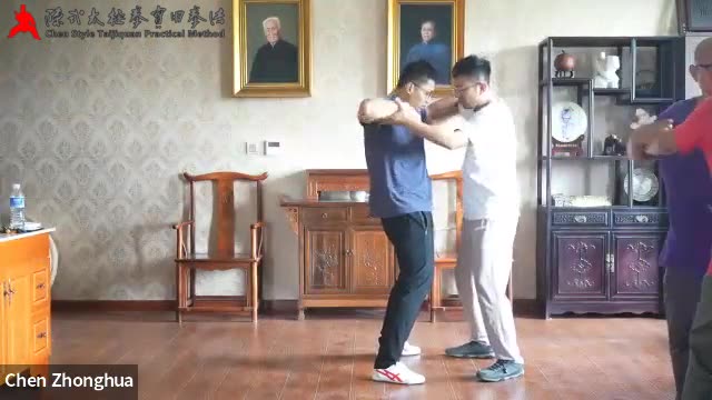 4:首先要能定住膻中(肘到膻中距离短,则快、灵活,但劲不够大),定不住就没有固定,这就叫没有中。定膻中挡不住时就要用到腰裆的力,对方力再大时要用到脚上的力,这是不同层次的功夫。