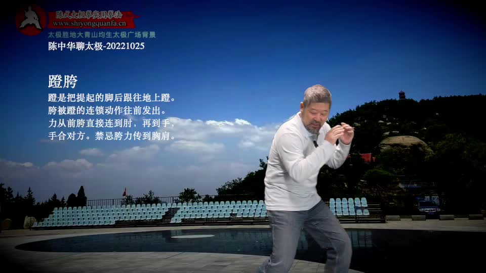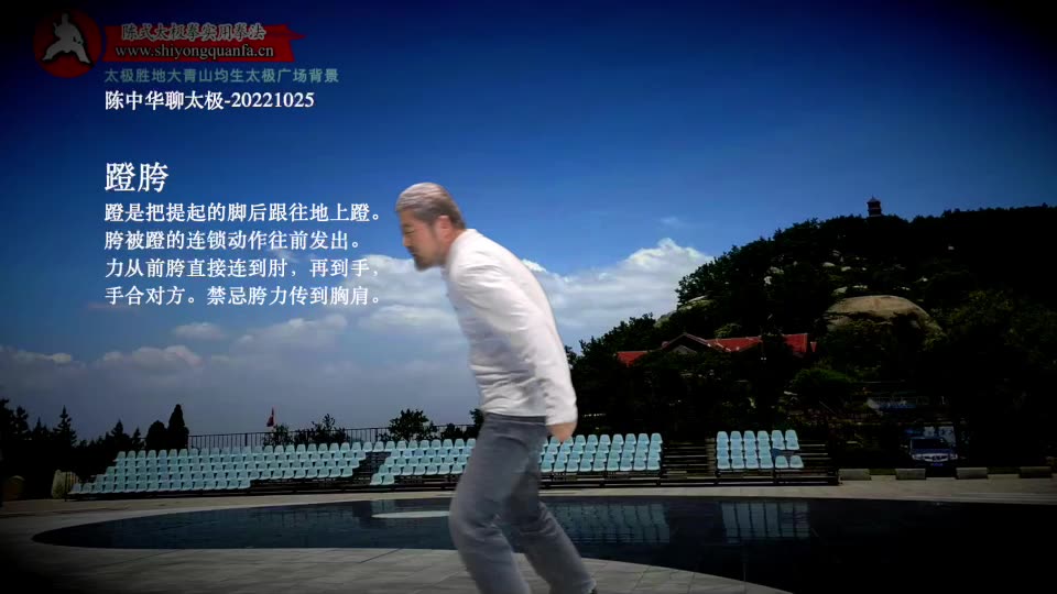 蹬胯-陈中华聊太极-20221025。蹬是把提起的脚后跟往地上蹬。胯被蹬的连锁动作往前发出。力从前胯直接连到肘,再到手,手合对方。禁忌胯力传到胸肩。