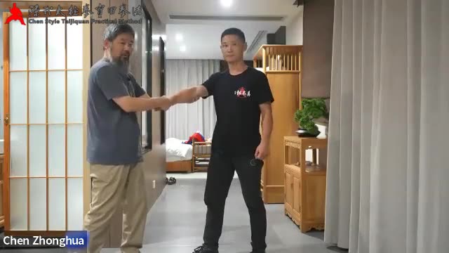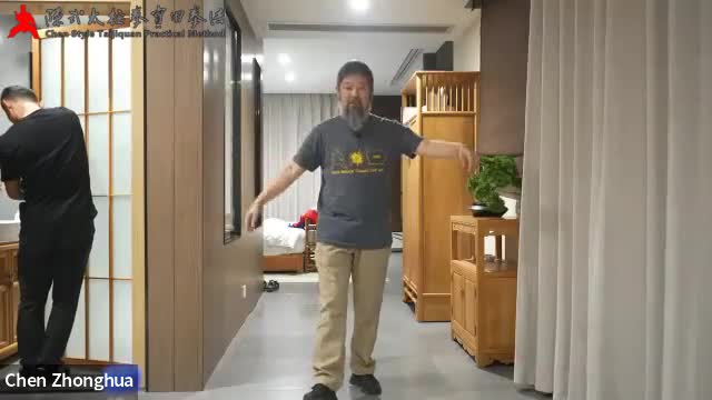 00:32 再收手指指向对方。“三股力”,手横向撑开,手臂内旋,手外旋,同时身体下坐,这形成三股力,对方破不开。