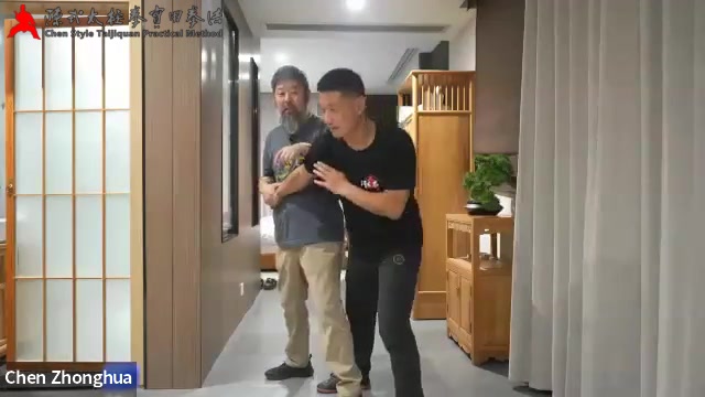 00:10 掩手肱捶,前手就是放在对方身上顶住,后手后拉,利用身体的旋转后拉,把对方拉倒。