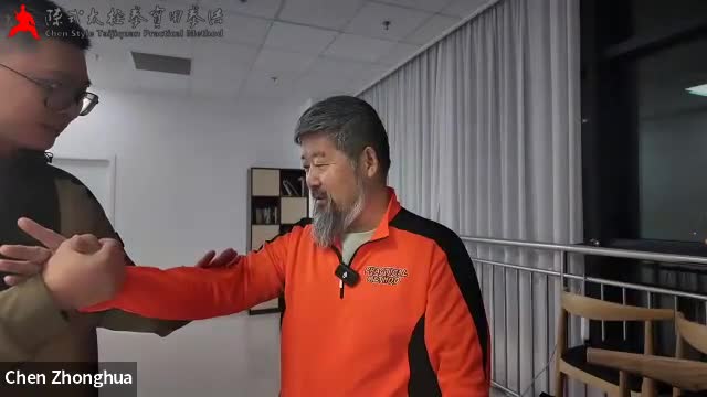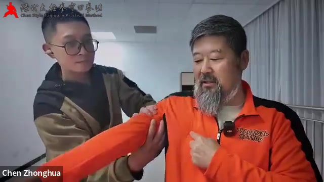 2、老师让宋教练协助给我们演示转肘动作,老师伸出右手,宋教练右手固定住老师的手,左手按着老师肘的位置,然后开始推老师的肘,老师说对于推的人来说,把对方的手定住了,右手推的时候一开始不能调整,就是推,推到不够了就转腰(视频看到的是老师手一动不动身体进去了),辐度就大了(又能推了),辐度的意思是通过沉肩、开腋窝、转腰、沉肘(填胯)他长出一大块来,如果晃了,或者只是转,是不行或不够的。宋教练按老师说的方法推老师的肘,已经做到极致没法再长了,老师的肘仍然有转的空间,并且身体仍然一点也没偏,宋教练说在做动作时感觉自己动了多少老师就给了多少,一直是有并且一直正好。老师说这个动作如果肩不开,就会别住顶住,就没法不动躯干了,躯干不动是怎么知道的,就是点住这一点(胸口上距腋窝一定距离),这点管着躯干,我们胳膊做动作时,这个点只是感觉到胳膊动作的影响力,他本身不动,你觉得有点动,他是因为类似余震这样的,如果动了,他是晃的。所以肩分开了,这个动作就能够按要求来做,分不开的话,他在肩上死了,就没有了,我们练拳时,这是第一个东西。