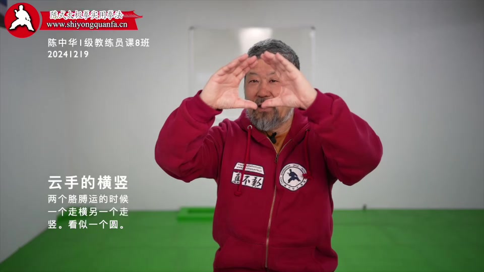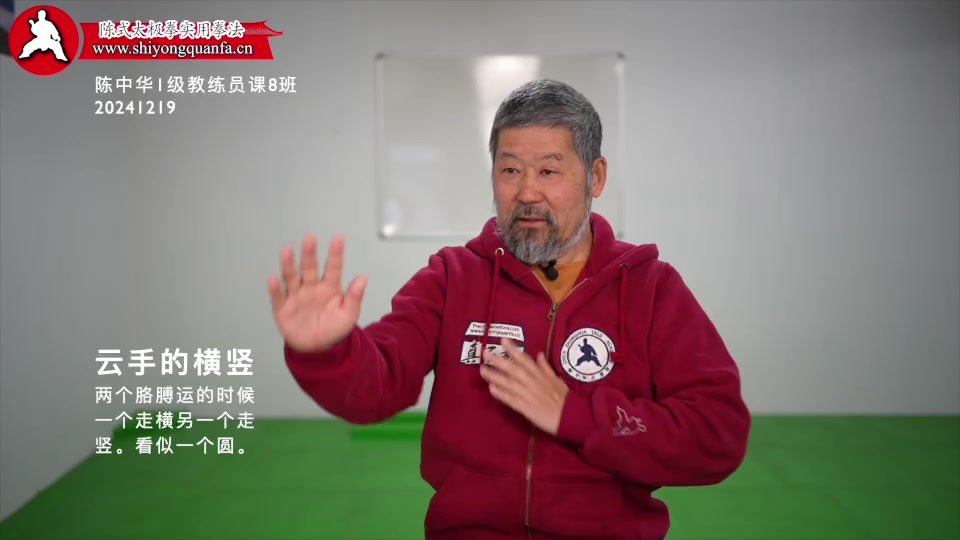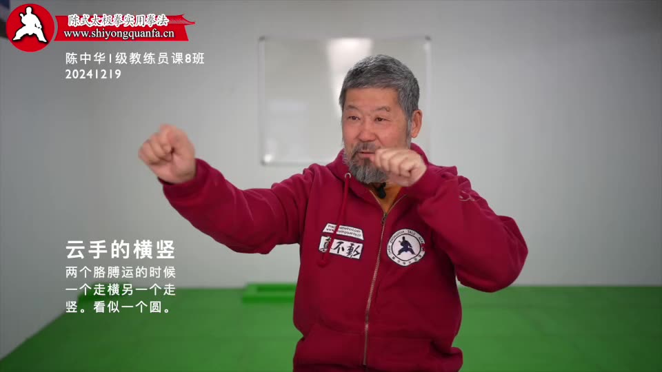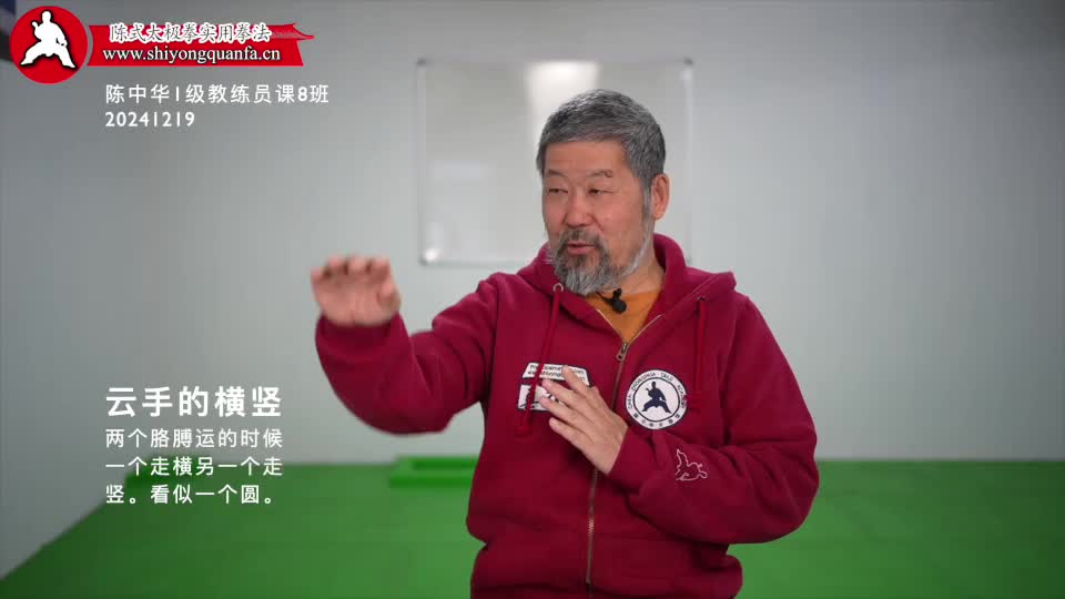 云手的横竖-陈中华1级教练员课8班-20241219。云手看上去两个胳膊是在划圆,其实一个胳膊做横的时候另一个胳膊一定要做竖。腰裆的转换使得整体外形看上去是在动中划圆。