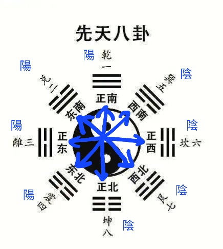先天八卦分陰陽兩儀,陽儀的卦對面必然是陰儀的卦,另外八個方向也有包含所有方向的意味,所以先天八卦反映著所有方向都是一陰一陽的平衡。因為所有方向都是平衡,先天八卦也代表圓形和球體。