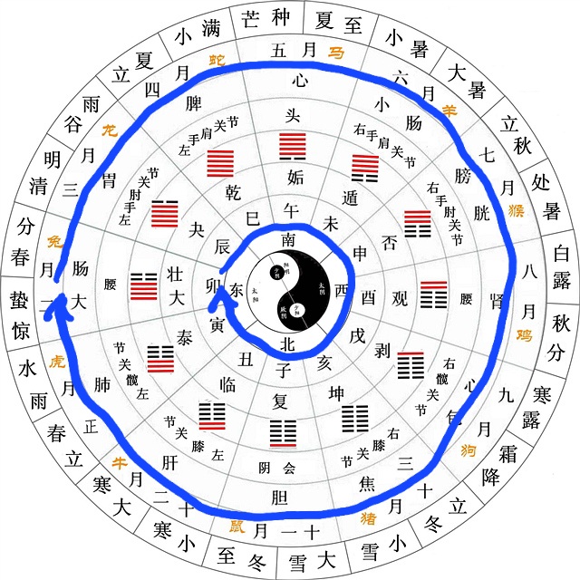 古人用後天八卦代表不同的週期現象,例如每日的時辰,每年的月分,每年的天氣氣象,甚至乎國家人事的變化,通通都按順時針旋轉方向在後天八卦上排列。