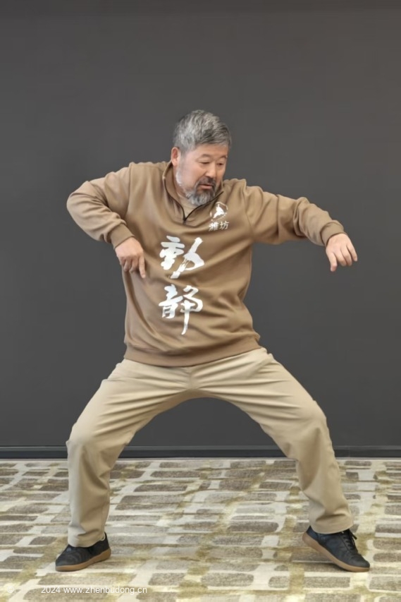 这个动作练出来之后,推手时看着站在那没动,实际上你前后的动作幅度特别大。从胸前这个位置转,一下出去、一下回来,手和胸的动作其实很大。如果练得不到位,自己感觉动得大,别人看就很小。一旦动作偏了左右,前后的发力距离就会变短。