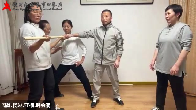 手不动,手握住沾有黄油的棍子上,肘的动必须与墙面和地面保持垂直,这样必须开肩才能做到,手上肘上有动作但没有力,手上是滑轮,手上是一个卯剪刀的卯,手腕不能打折不能有弯的动作,这节课最主要的是手的不动,什么叫手上的不动??师父拿着棍子举了几个例子,手上拿上参照物就一目了然了。
