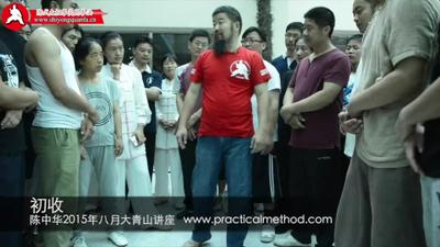这个初收,要到这儿来要抬一下。就要打你的裆。你这一过我一抬这个地方,我不用踢你我一抬你裆就撞上了。所以这一抬,你一看不好一退,他就踢进去了。很简单不用使劲儿。因为是追着你走的,顺着劲儿走的,不是我去找你。收获了。谢谢。