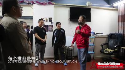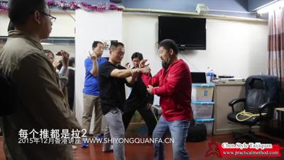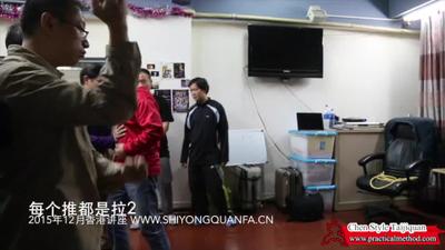 但是,按照洪老师教的,洪老师说的不是把推变成拉。洪老师说的是换点就是我用这个地方使劲,等你也使劲的时候,我这个地方绑住了,就是你也抓住我了,我用他当。他还是把…因为你换点是一个作一个动作地讲。我呢,就是说,从推要变成拉我是给他理论化,升华到一个规律。就是你碰到任何事情你都得走这个规律。