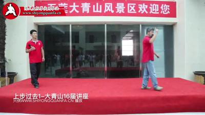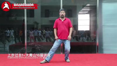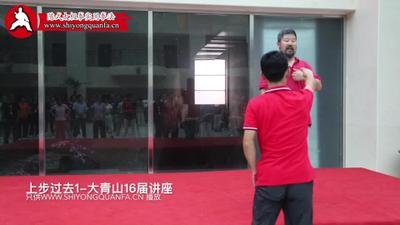 l 陈旭到我后面去。你在这也行,到底下,‘哎’马步下去,两只手戳着膝盖,近点,近点。‘好’蹲下去,别堵着人家,我在这,我上身体的时候就把他调整过来,你们现在这样了,看出来膝盖跑了吧,不要它跑,再看我身体,‘哎’,高一点在这,你看他对着我的胸,你们上步的时候这么上来了。看到了吧!看到没有,跑了,上的时候不能跑,落脚,‘看’过来的时候膝盖没动,这是第一,这几个位置是在哪。第二呢,一步做一个动作,不要这样,全做完了。一,二是落脚,二,三调整过来。三个动作,一定不要,完了。继续,三个动作,脚落地,不要动,脚落地就落地,把身体调到中间,动了膝盖,调到中间,动了膝盖。